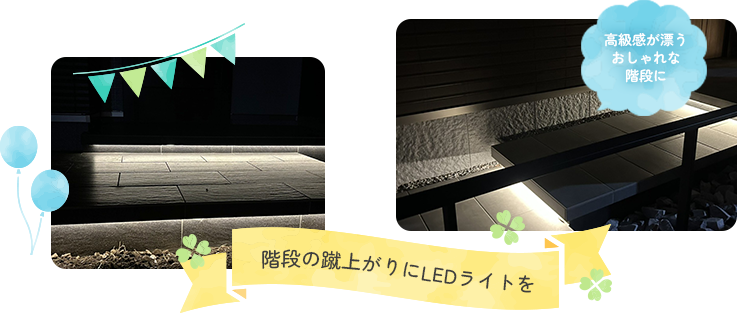 さらに、LED照明を組み込むことで、夜間の足元を安全に照らしながら、外観に上質な雰囲気を加えることも可能。